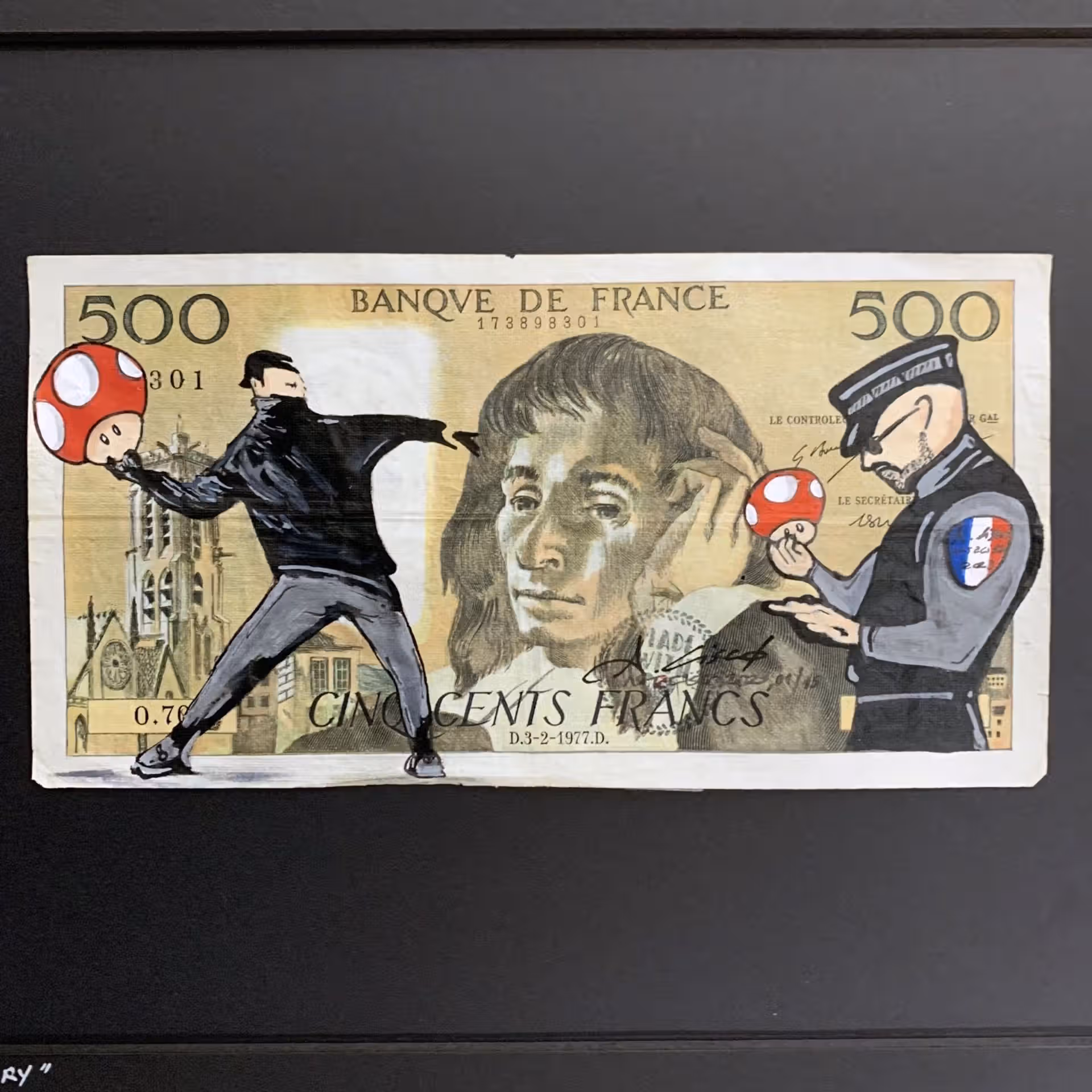 Dessin réalisé sur un authentique billet de 500Frs appelé « Pascal » dont le thème est un hommage et mise en abîme de l’artiste Banksy.