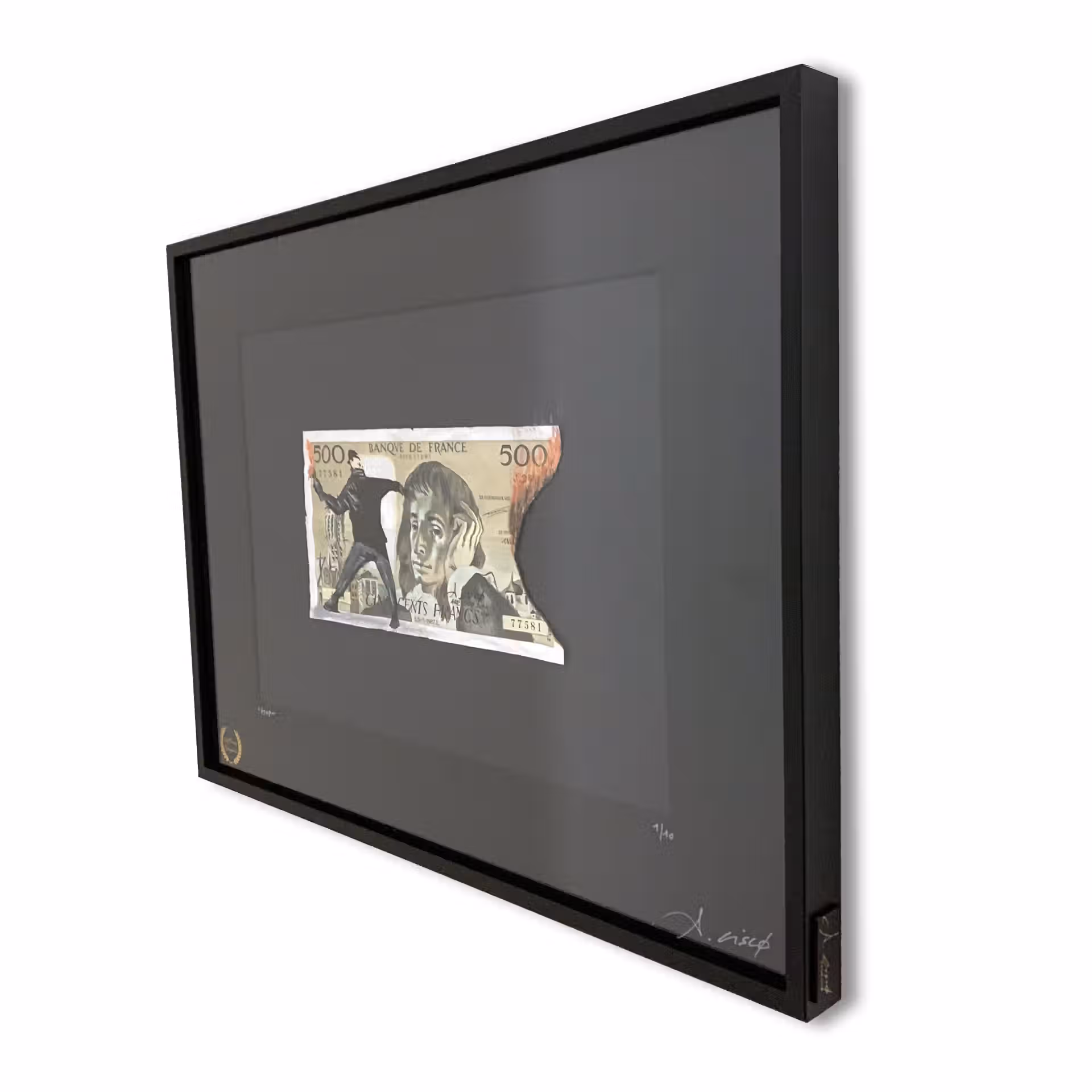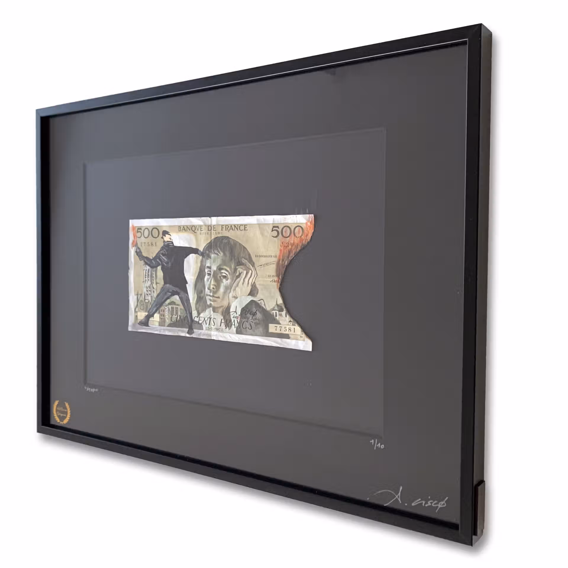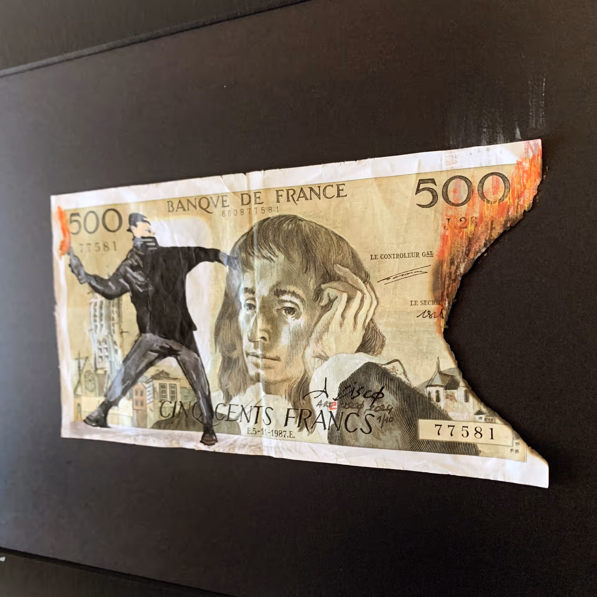 Dessin réalisé sur un authentique billet de 500 Francs appelé « Pascal » dont le thème est un hommage et mise en abîme de l’artiste Banksy. Le titre « Stop » est un appel à cesser les violences, pour vivre dans un monde meilleur.