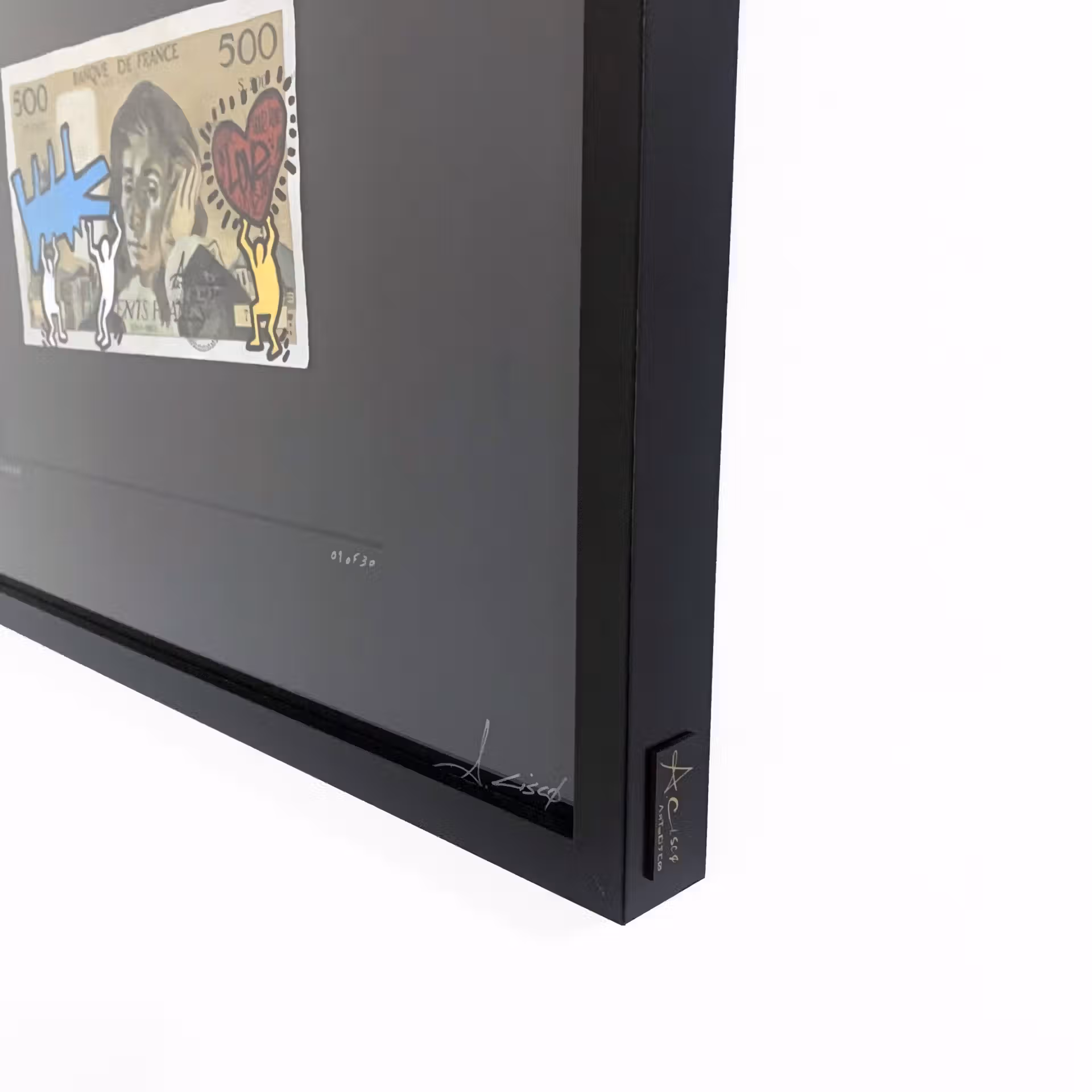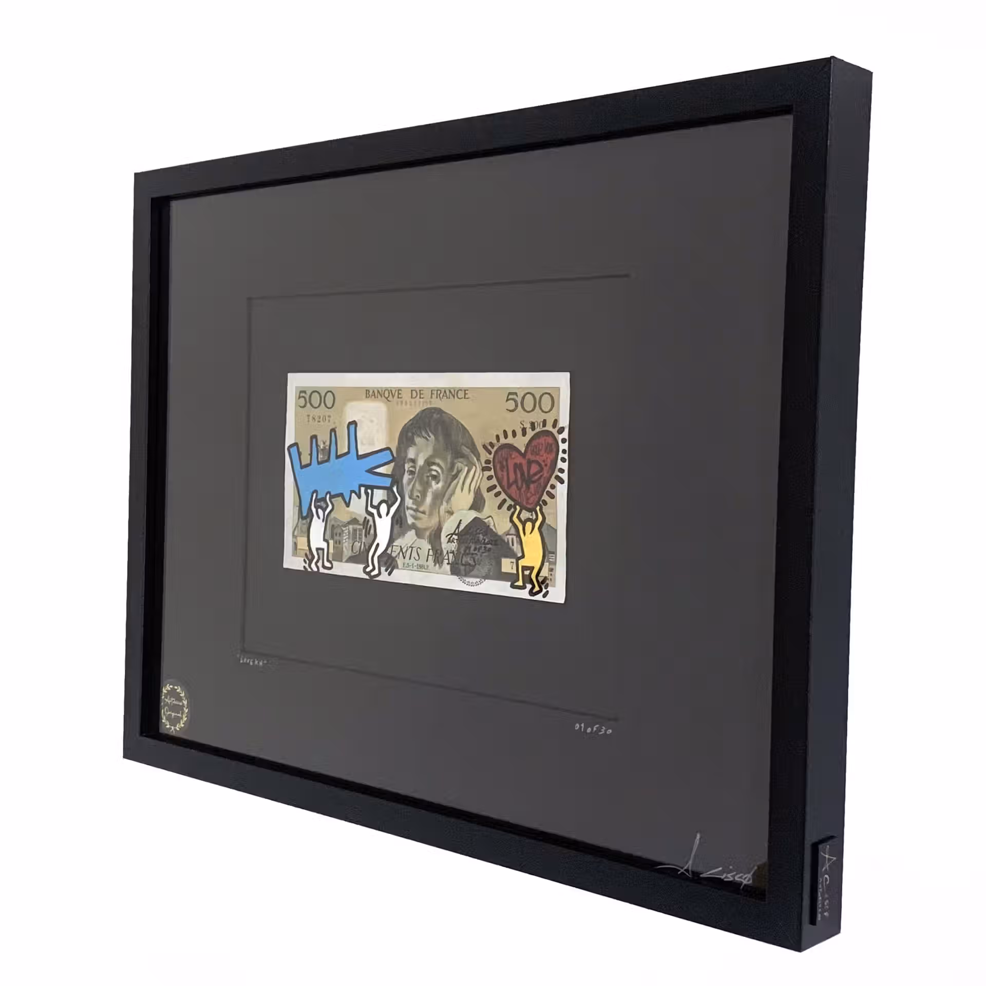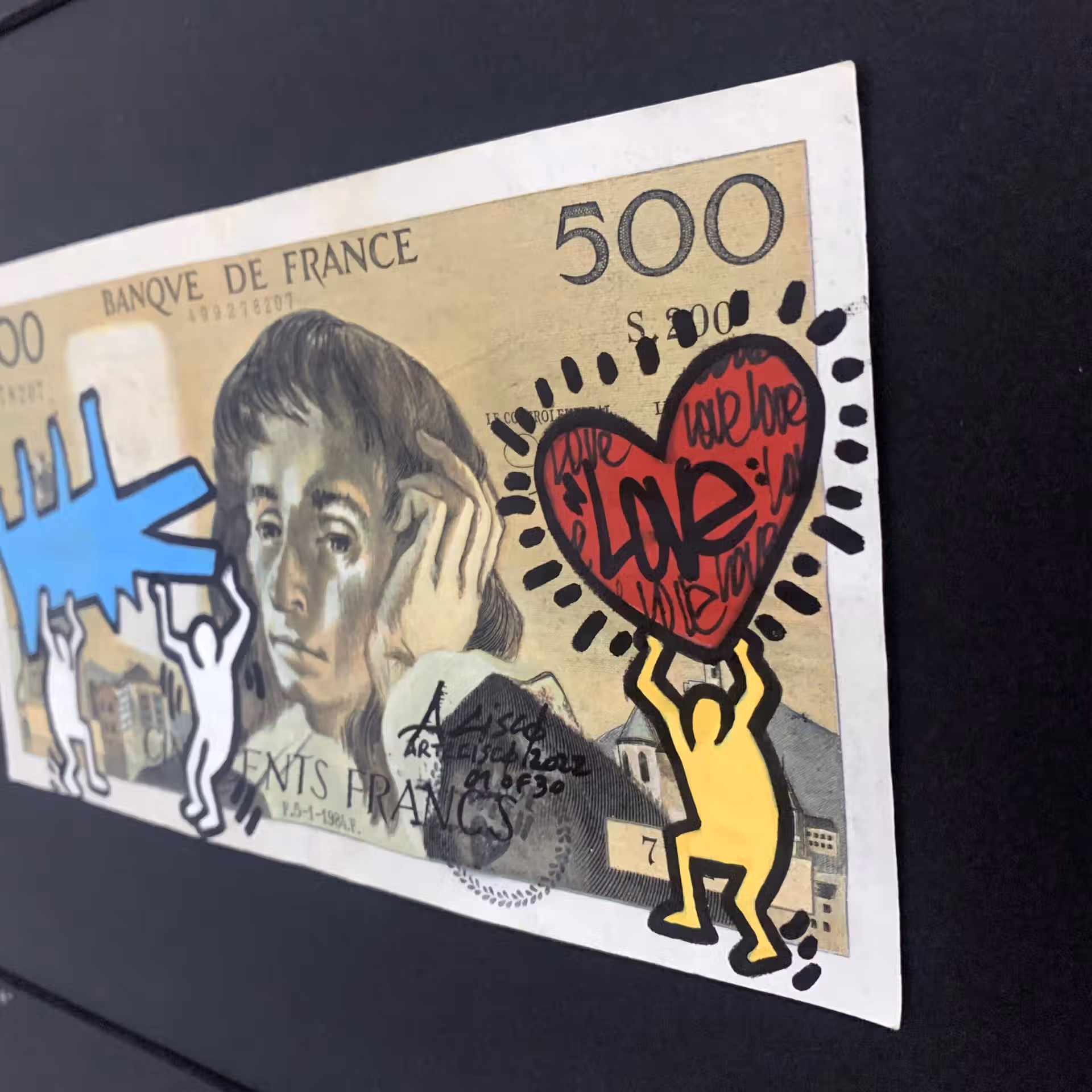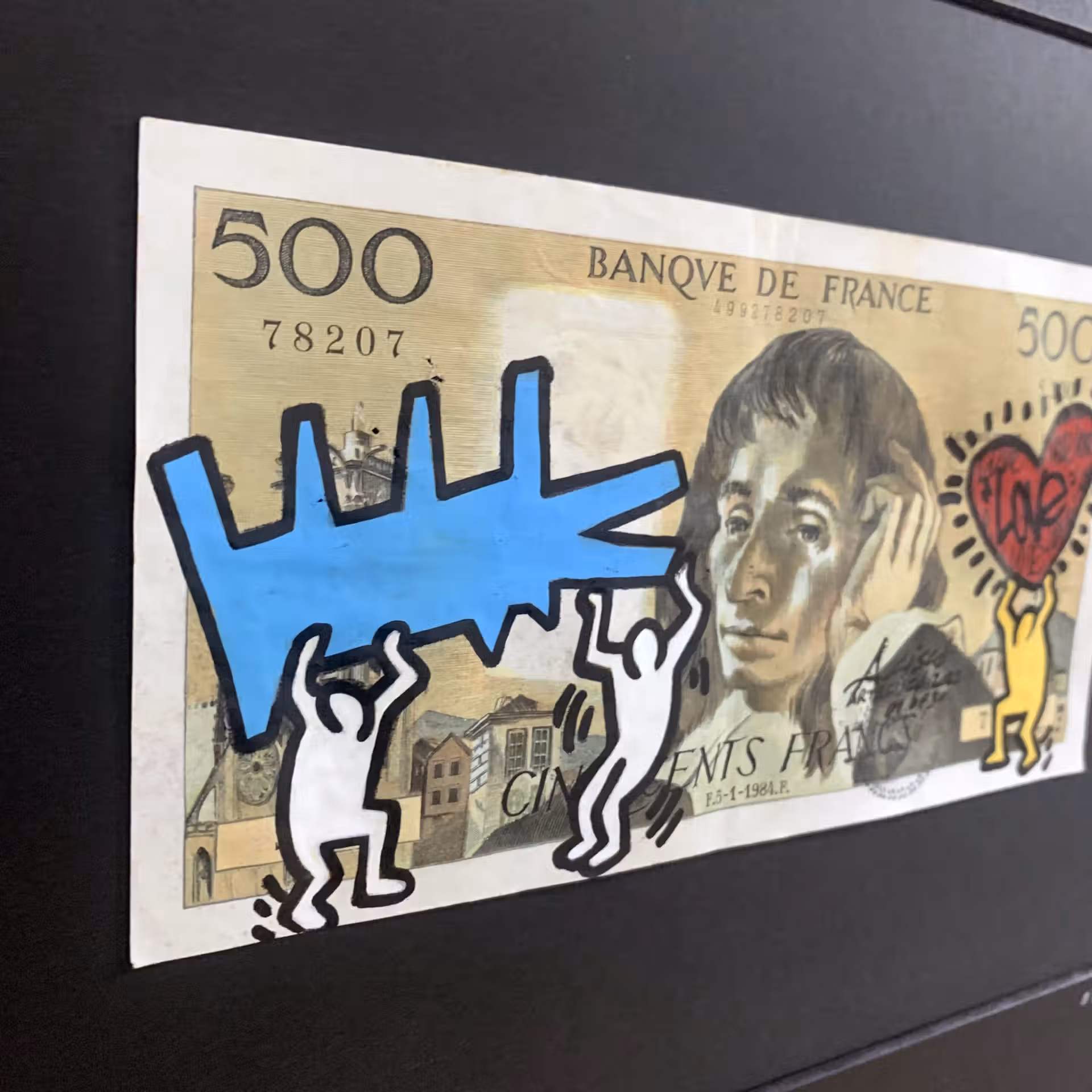Il s’agit ici d’un dessin réalisé sur un authentique billet de 500Frs appelé « Pascal » dont le thème est un hommage et mise en abîme de Keith Haring.